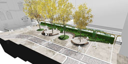 Two new public spaces are proposed either side of Upper Thames Street in the City of London to once again reintroduce The City with the River Thames. Located at Queenhithe, one of the few remaining harbours or hythes on the northbank and home of the Grade 1 Wren Church of St James Garlickhythe (historically known as the beacon for arriving sailors), the spatial designs exploit level change, existing trees and connections to the river to develop a series of attractive, connected and inviting green public spaces. Continuous sinuous seating, cantilevered planted pergolas and landscape terraces combine to enhance the environment to tackle local microclimatic challenges of filtration of air borne pollutants along Upper Thames Street. Enhanced pedestrian connections supported by the groundfloor activities of two neighbouring hotel developments and historic guild halls, will recast Little Trinity Lane and Queenhithe public realm as attractive destinations enroute to the River.