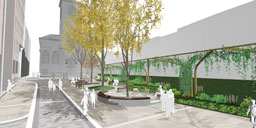 The design response seeks to clarify the courtyard space, giving greater prominence to the Church facade and tower beyond. The lower historic routeway is retained, with new stepped and ramped access points up in to the raised churchyard, which will benefit from a more open character, new paving and planting beds. The landscape design proposals seek to not only increase the natural visibility and biodiversity of the space, but also offer a natural infiltration of all the site water runoff from this land-locked site. In this way, soft landscape in particular will provide a natural wayfinding device and evident sustainable measure designed to enhance the setting of this significant City Church.
