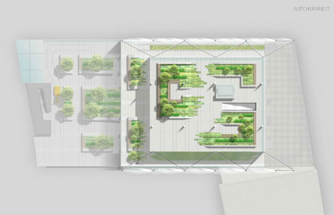 The landscape design response provides a series of simple, robust and interconnected courtyards, terraces and arrival spaces. Given the contained nature of the site, each courtyard has been developed to maximise available natural light, inject a distinctive landscape character and actively engage with the internal building use to provide a constant and attractive lush green backdrop.