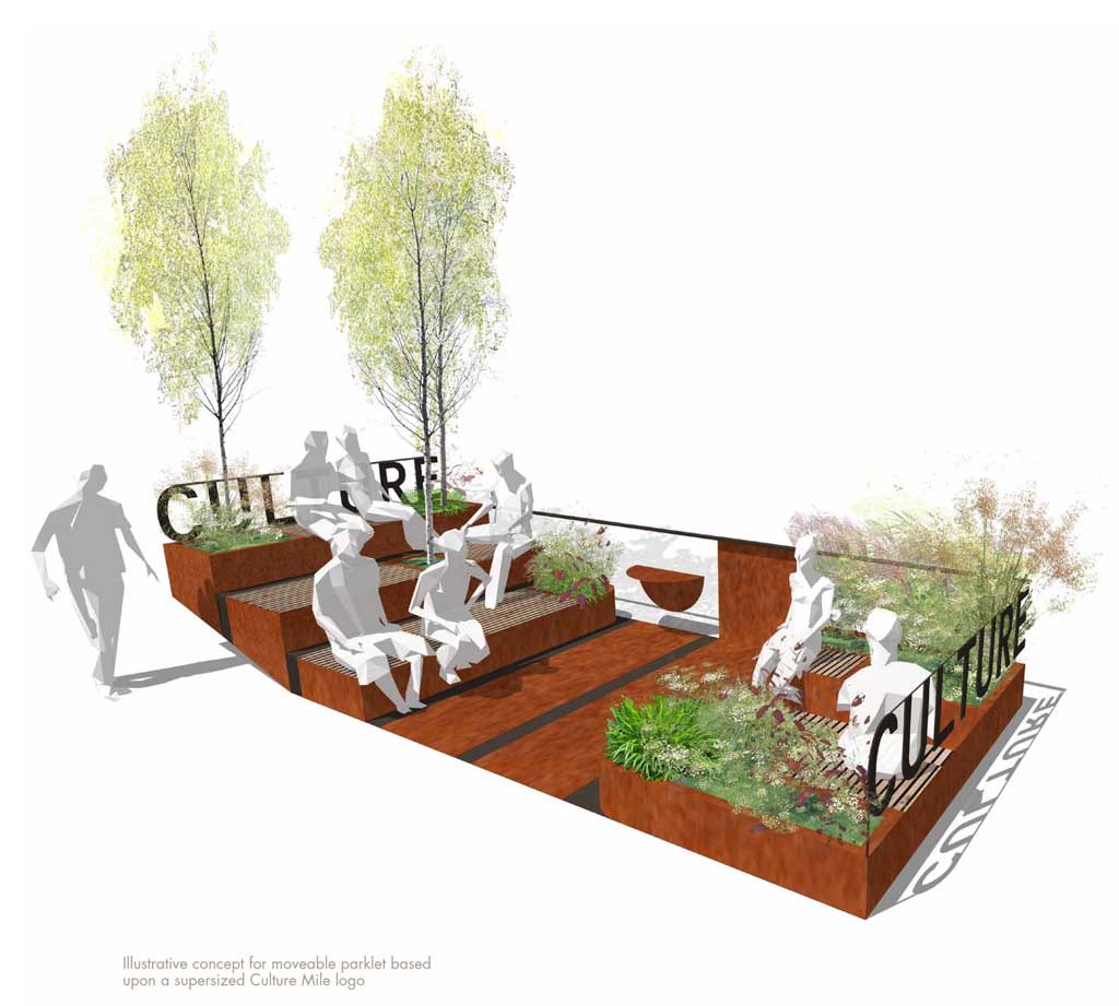 Working in collaboration with FutureCity and Hat-Trick Design, the cultural vision was captured as a series of books identifying the vision, the projects and the toolkit. This suite of design documents was designed to allow stakeholders to not only ‘buy-in’ to the idea of a cultural district but also provide design guidance to deliver and direct the many spatial opportunities and material/furniture specifications within the public realm.