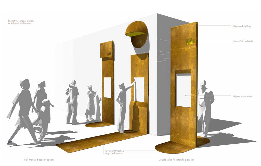 Growth Industry, in partnership with Wolfstrome, were commissioned to test the identity interpretation of the Culture Mile brand and advise how it could be applied within the public realm. Following extensive area analysis, an Identity and Interpretation strategy was established which highlighted gateways, movement patterns and opportunities for wayfaring and brand placement to help define the extent of Culture Mile. Concise guidelines for colour, scale, design and implementation were developed, supported by a suite of options for brand application within the streetscape including wayfinding markers, street furniture items, signage and artworks of a temporary and permanent nature.