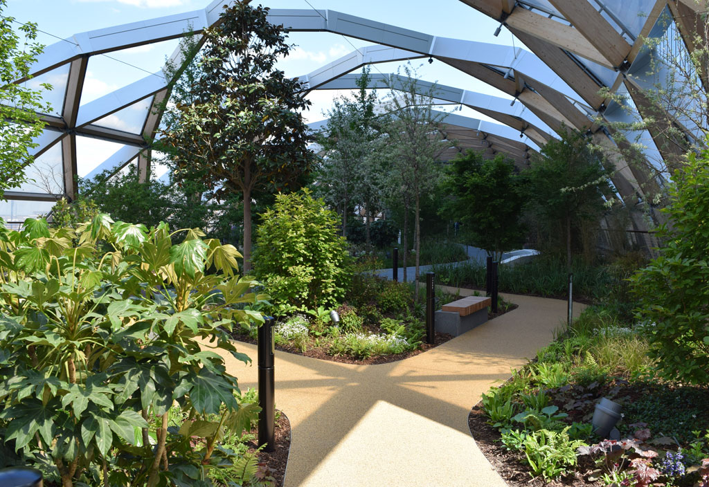 The Crossrail station at Canary Wharf incorporates a large, predominantly green, rooftop park for use by both the local residents and passengers. The planting design concept and palette were developed by Growth Industry in response to a strong cultural and historic narrative, inspired by the discoveries of the great Victorian plant collectors Hooker and Douglas and the incoming exotic species that arrived through the local docks. The space is divided to showcase both Occidental and Oriental species. The semi-permeable canopy structure enclosing the park helps to create a localised micro-climate allowing the use of more tender species in a location that is subject to strong wind turbulence created by the adjacent tall buildings. Careful species selection has been necessary to overcome physical constraints, including shallow substrate depth and overhead structures, in order to minimise future maintenance requirements. Environmental change and proposed local development were also considered in order to offer a sustainable and futureproof soft landscape solution. The park opened in May 2015 and has already proved to be a very popular venue for community events.