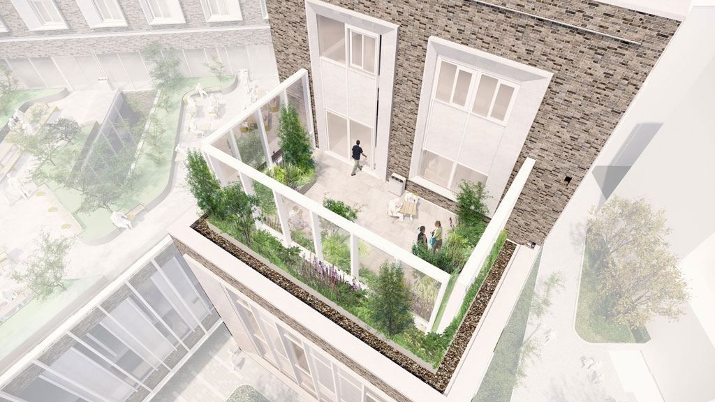 The biophilic ethos of this development is expressed through the high proportion of planting upon each of the roof terrace gardens which gives each space an immersive green feel and ensures that adjacent windows look out on a calming, lush green environment. Staff and inpatient terraces invite users to engage with south facing terraces for both work, collaboration and recuperation, with two upper terraces providing vital access to nature and fresh air for the inhouse school provision. The groundfloor landscape is delivers a new pedestrian campus spine, supported by informal green space and biodiverse meadows to establish a welcoming and inclusive piece of public realm, a place not only to pass through but to inhabit.