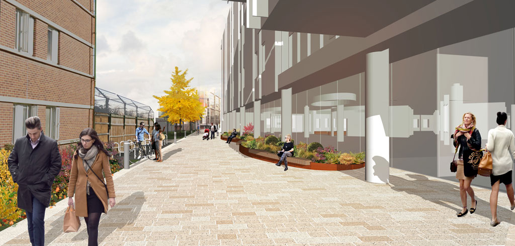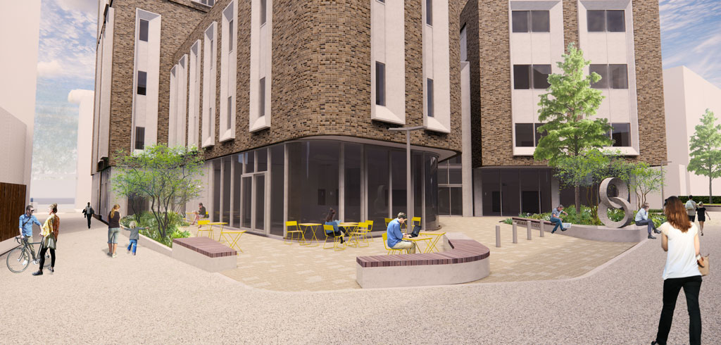 The new public space will benefit from active ground floor use associated with the newly developed Apart Hotel and opened up access routes along Vine Street and to the Minories.