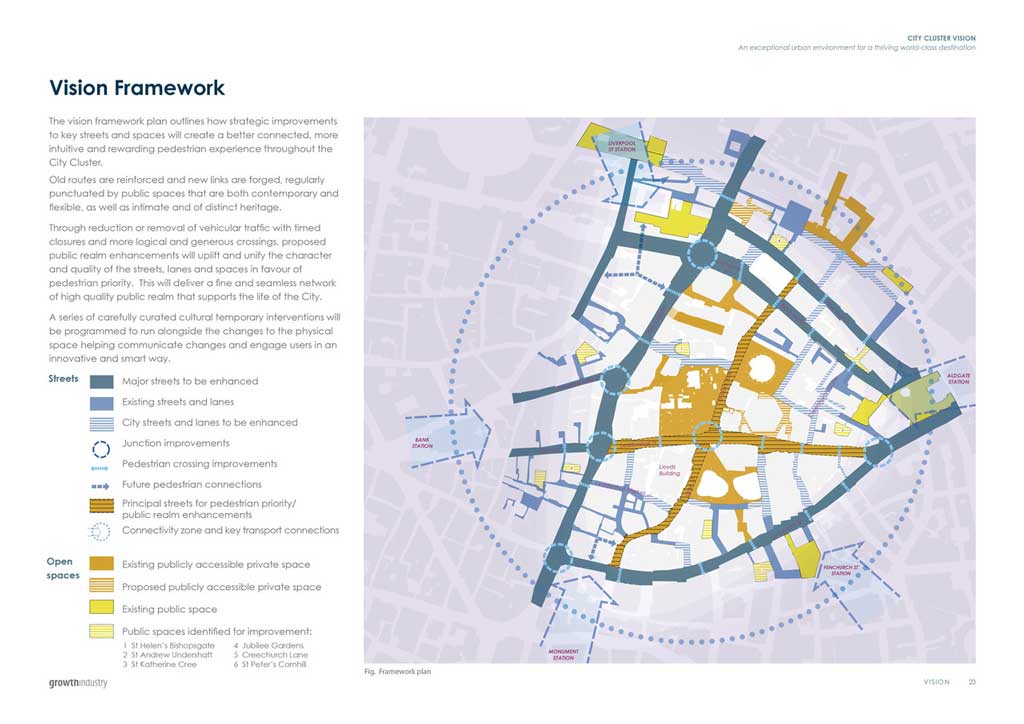 Client: City Public Realm, Corporation of LondonGrowth Industry were appointed by the City of London to prepare a strategic public realm vision and concept design proposals for the streets and spaces at the heart of the City Cluster.
