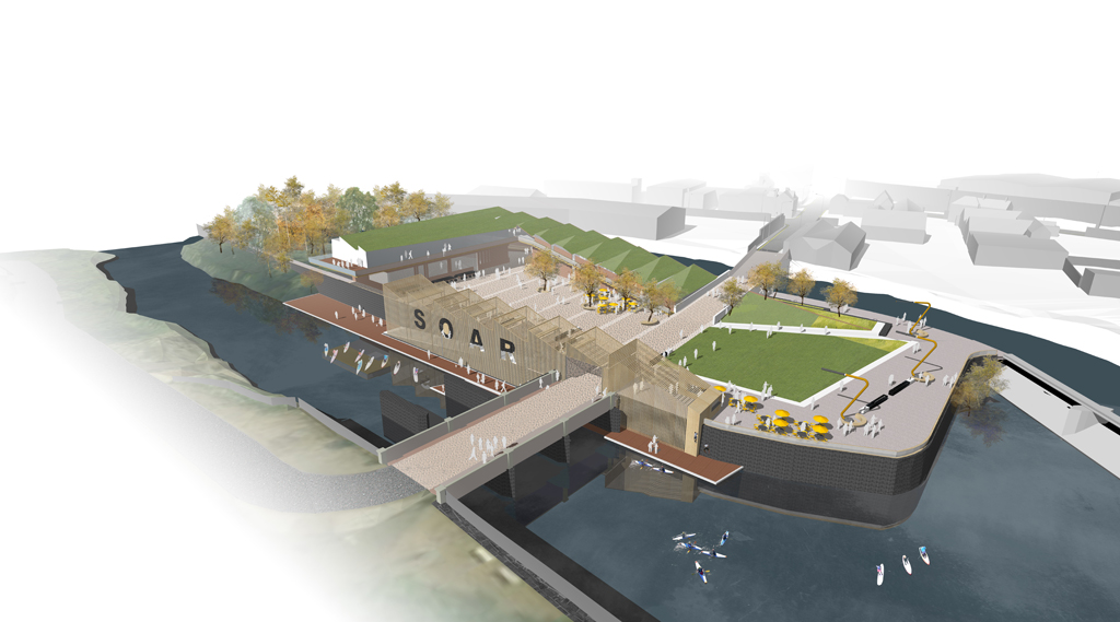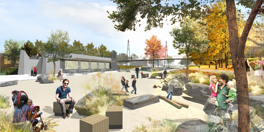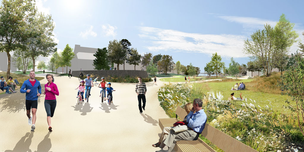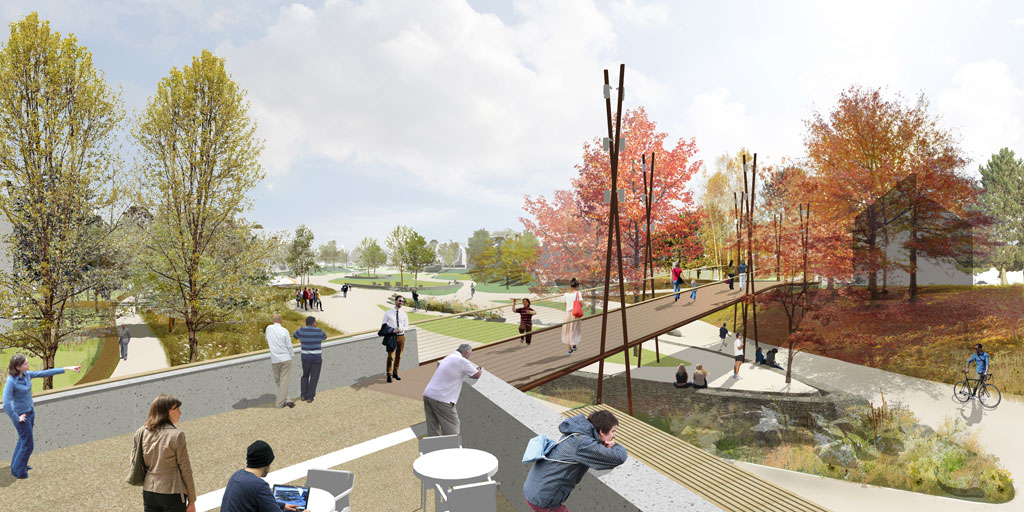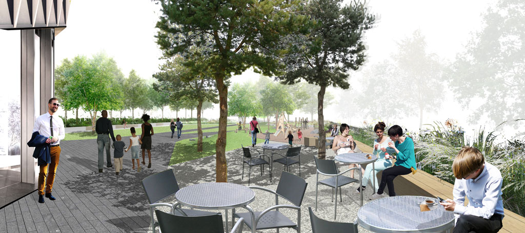 Drawing inspiration from the historic wooded nature of the Weald and influence of river-incised landscapes, the new half mile linear park proposed an immersive landscape experience, exploiting and accentuating site topography and existing trees balanced with new habitat and recreational spaces. Growth Industry proposed a park experience focused along a meandering central pathway, expanding and contracting along its length to accommodate incidental park activities, play, seating and viewing opportunities. The design introduced a series upper meadows at the highest and more open part of the site, gradually transitioning in habitat and spatial enclosure into more intimate, sunny island lawns and terminating at an arrival plaza and feature play space, anchored by a multilevel community building. Cross connecting greenways announced their arrival within the park in the form of a feature observation platform and slender stilt bridge, recalling the hop pickers and stilt walkers once so familiar to the areas heritage.