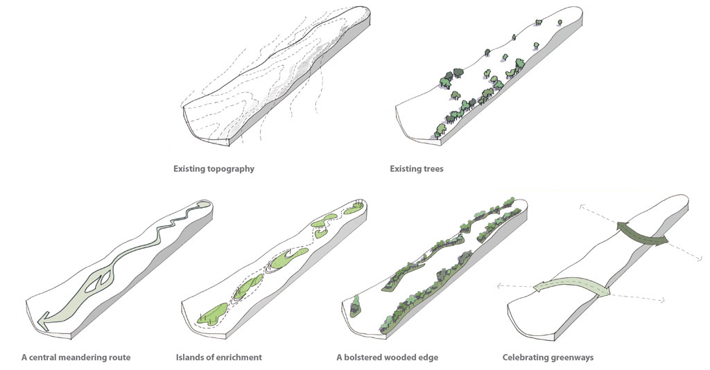 Client: ConfidentialGrowth Industry developed design proposals for a new linear park as part of an invited competition in the Weald of Kent.