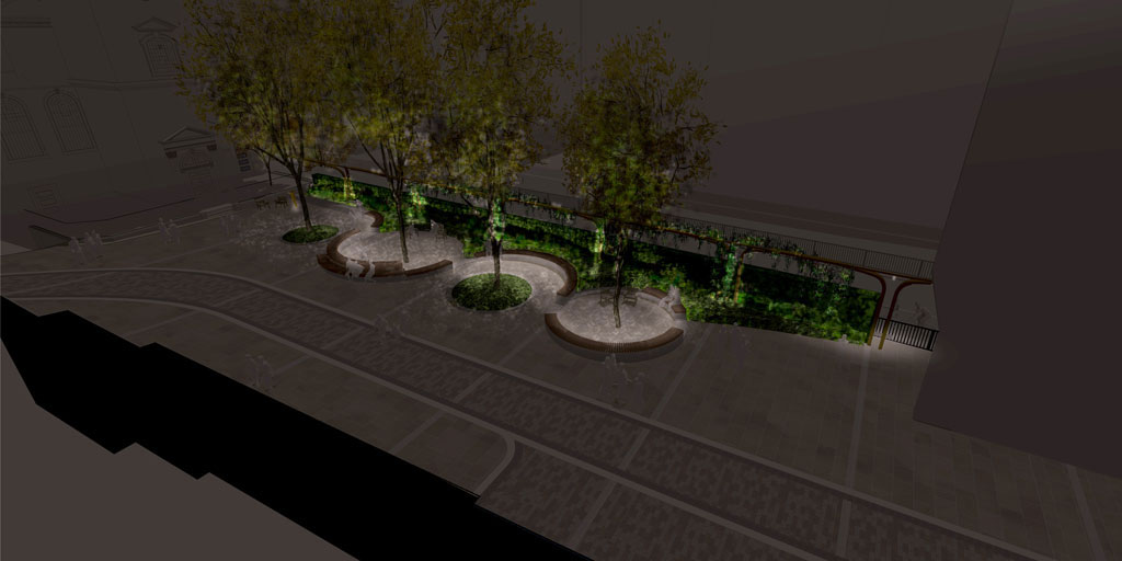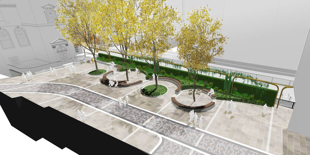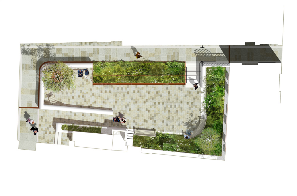 The design response seeks to clarify the courtyard space, giving greater prominence to the Church facade and tower beyond. The lower historic routeway is retained, with new stepped and ramped access points up in to the raised churchyard, which will benefit from a more open character, new paving and planting beds. The landscape design proposals seek to not only increase the natural visibility and biodiversity of the space, but also offer a natural infiltration of all the site water runoff from this land-locked site. In this way, soft landscape in particular will provide a natural wayfinding device and evident sustainable measure designed to enhance the setting of this significant City Church.
