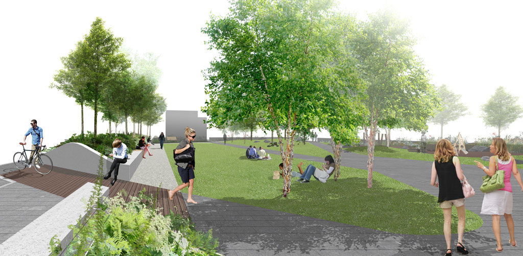 Growth Industry were appointed by internationally renowned Make Architects to undertake landscape designs for the proposed residential development of the Madison. The design approach has been inspired by the rich and varied past of the site, drawing inspiration both physically and metaphorically from the polder system employed by the Dutch engineers credited with successfully draining and reclaiming the Isle of Dogs. The resultant design of the Madison Garden is a sizeable residential garden occupying 70% of available groundfloor space. The Garden character is defined by open lawns enclosed by a tree lined planted embankment and a sunken planted swale. The Garden will be semi-private/public in nature and will serve not only the tower residents but also the wider community, accommodating a wide range of uses and activities including external cafe terrace and outdoor formal and incidental play set within a strong natural environment.