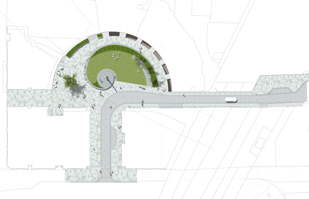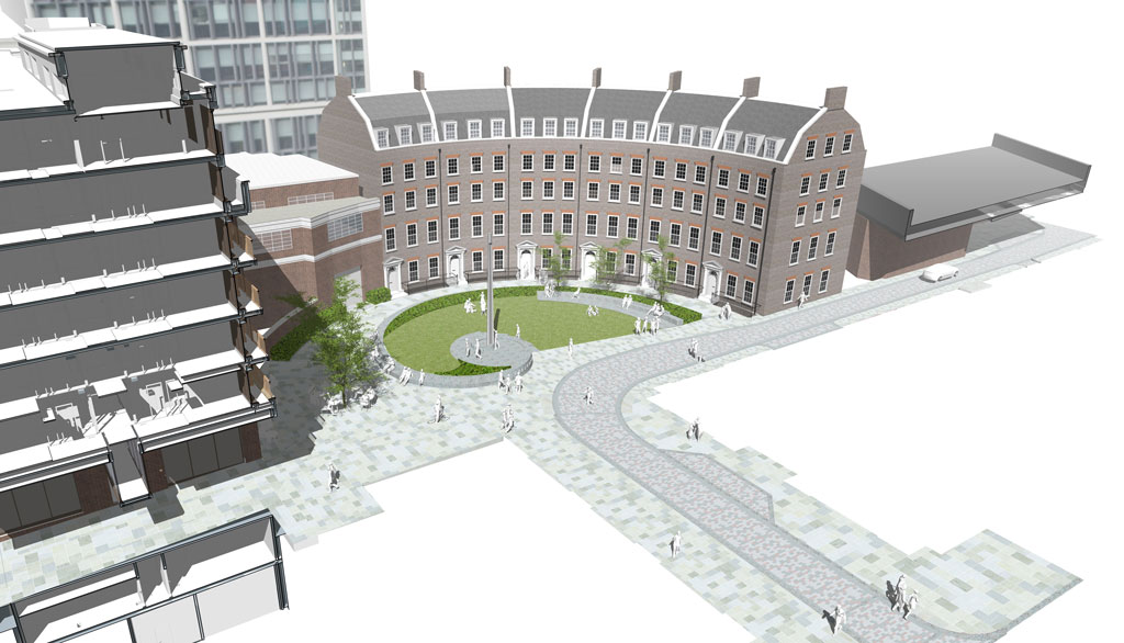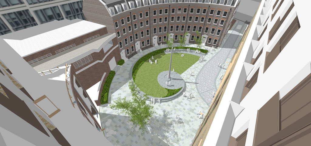 In response to the redeveloped 100 Minories Apart Hotel, public realm enhancements have focussed on creating a pedestrian-friendly landscape space. The Crescent, originally envisaged as a sequence of Square, Crescent and Circus by George Dance in1767, offers an important contribution in the evolution of public space creation within London and the UK. It introduced the concept of curved street frontages to London and in doing so was the first planned crescent and circus in London.