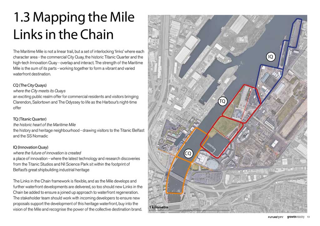 Drawing inspiration from the prestigious maritime heritage of the Harland and Wolff shipyard, Maritime Mile is envisaged not as a linear trail, but as a set of interlocking ‘links’ in a chain where each character area - the commercial City Quay, the historic Titanic Quarter and the high-tech Innovation Quay - overlap and interact. The strength of the Maritime Mile is the sum of its parts - working together to form a vibrant and varied waterfront destination.