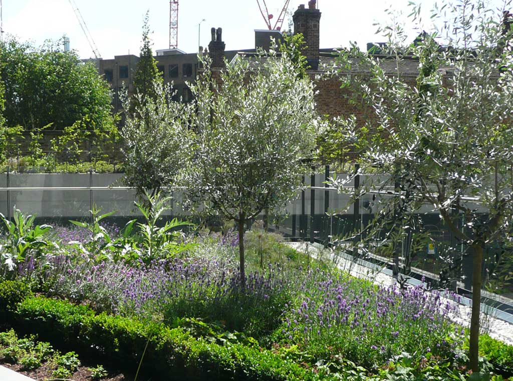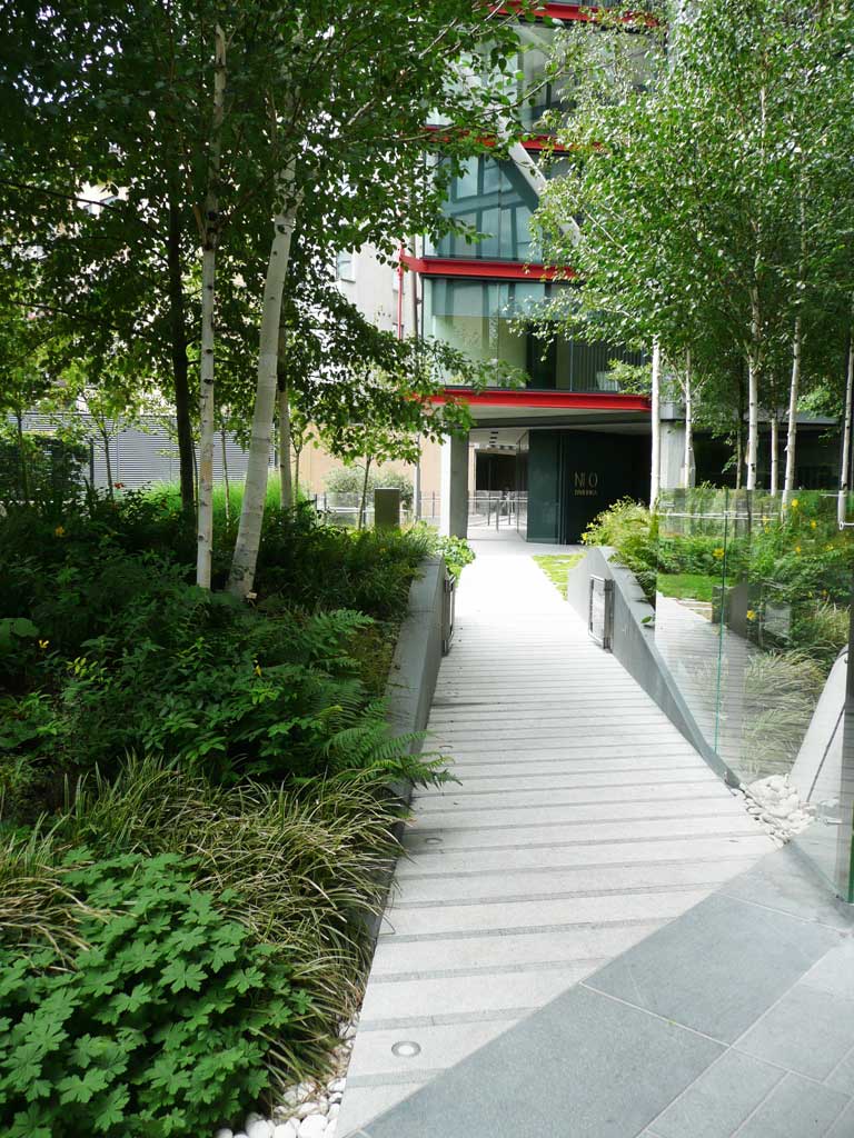 The final phase of this award-winning luxury apartment development on London’s South Bank has opened following completion of the planting during summer 2012. The linear arrangement of the landscape is reinforced by berms planted with semi-mature birch. High density underplanting comprising grasses, ferns and shade tolerant herbaceous perennials enhances local biodiversity and incorporates many native species. The residents garden at the centre of the scheme comprises formal lawn with more traditional herbaceous borders providing year round floral interest and a small fruit orchard. A resident’s herb garden provides further diversity with a wide range of scented and edible species contained within box hedging and half standard olive trees. The requirement for a ‘Chelsea Show Garden’ finish from day one to assist with marketing required unusually large numbers of plants, providing a unique logistical challenge, particularly as the launch date required that the scheme be completed outside of the normal planting season. In 2013 the scheme was honoured with a Landscape Institute Award.
