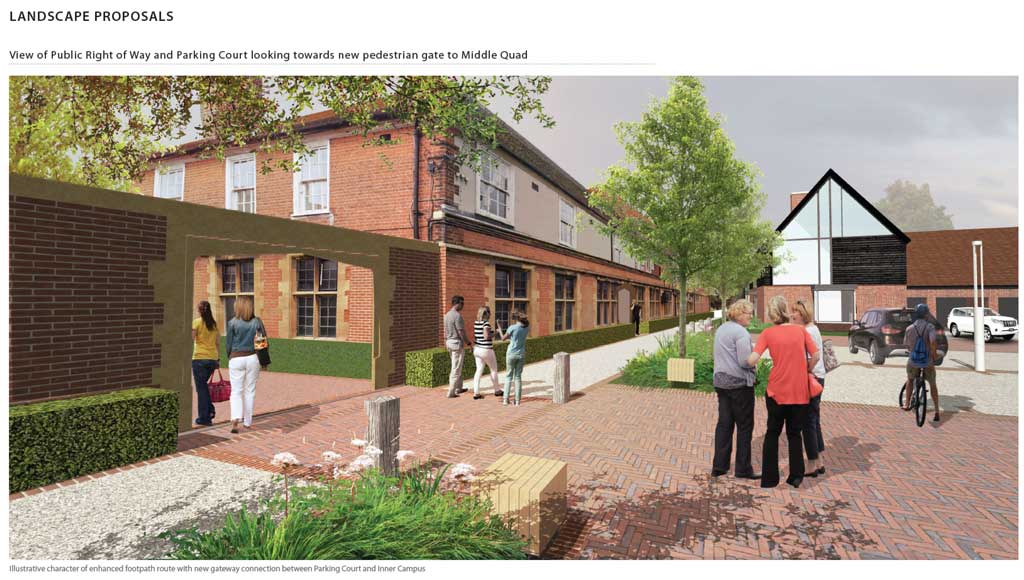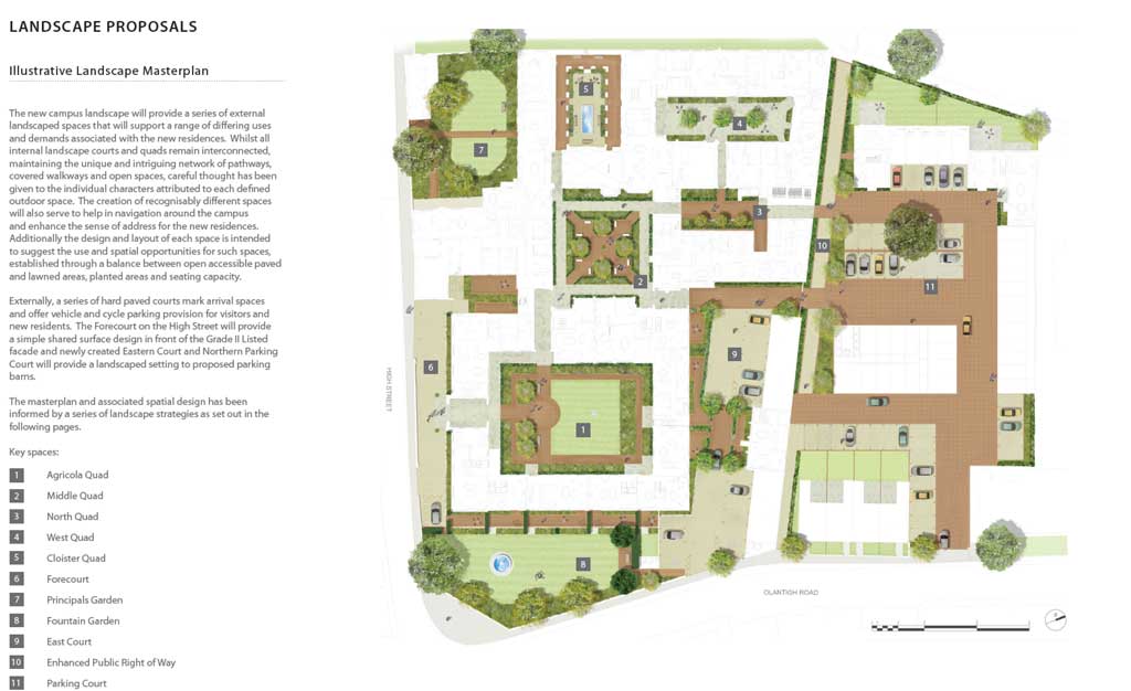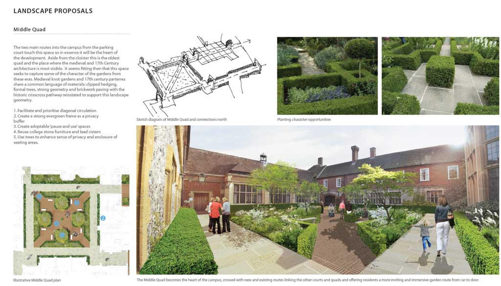 This Listed college campus has evolved over 500 years from it's Medieval origins as a monastic college through to it's final use as the Agricultural arm of Imperial College London. The revitalised site masterplan presents a rich tapestry of courtyards, cloisters, quads and private gardens combined with 21st Century residential needs such as parking, disabled access and security enhancements. A new landscape character in the English garden style is instilled within the campus offering lush, inviting landscape spaces for new residents that draw inspiration and reference from the horticultural expertise of the former college.